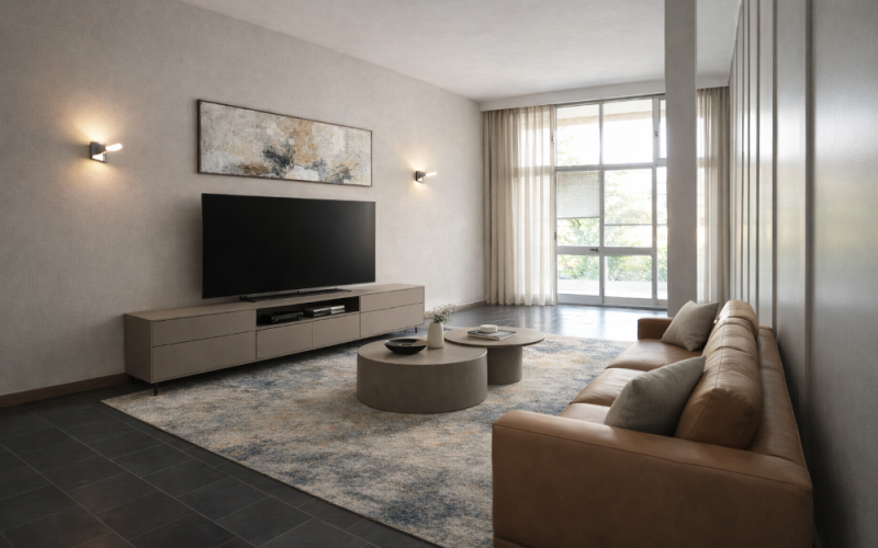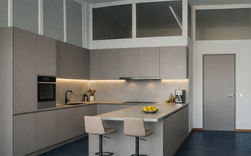 The apartment is located in a small building consisting of both housing units and commercial units.