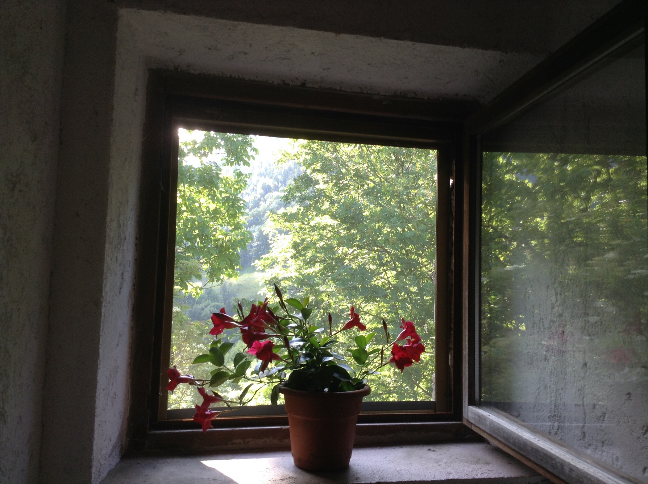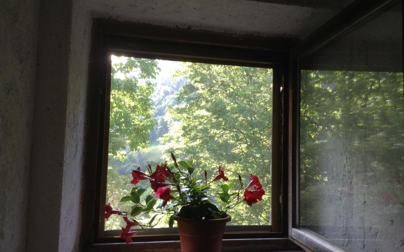 Depuis les fenêtres, qui rendent la pièce lumineuse et bien ventilée, vous pouvez profiter de la vue sur la verdure environnante.
