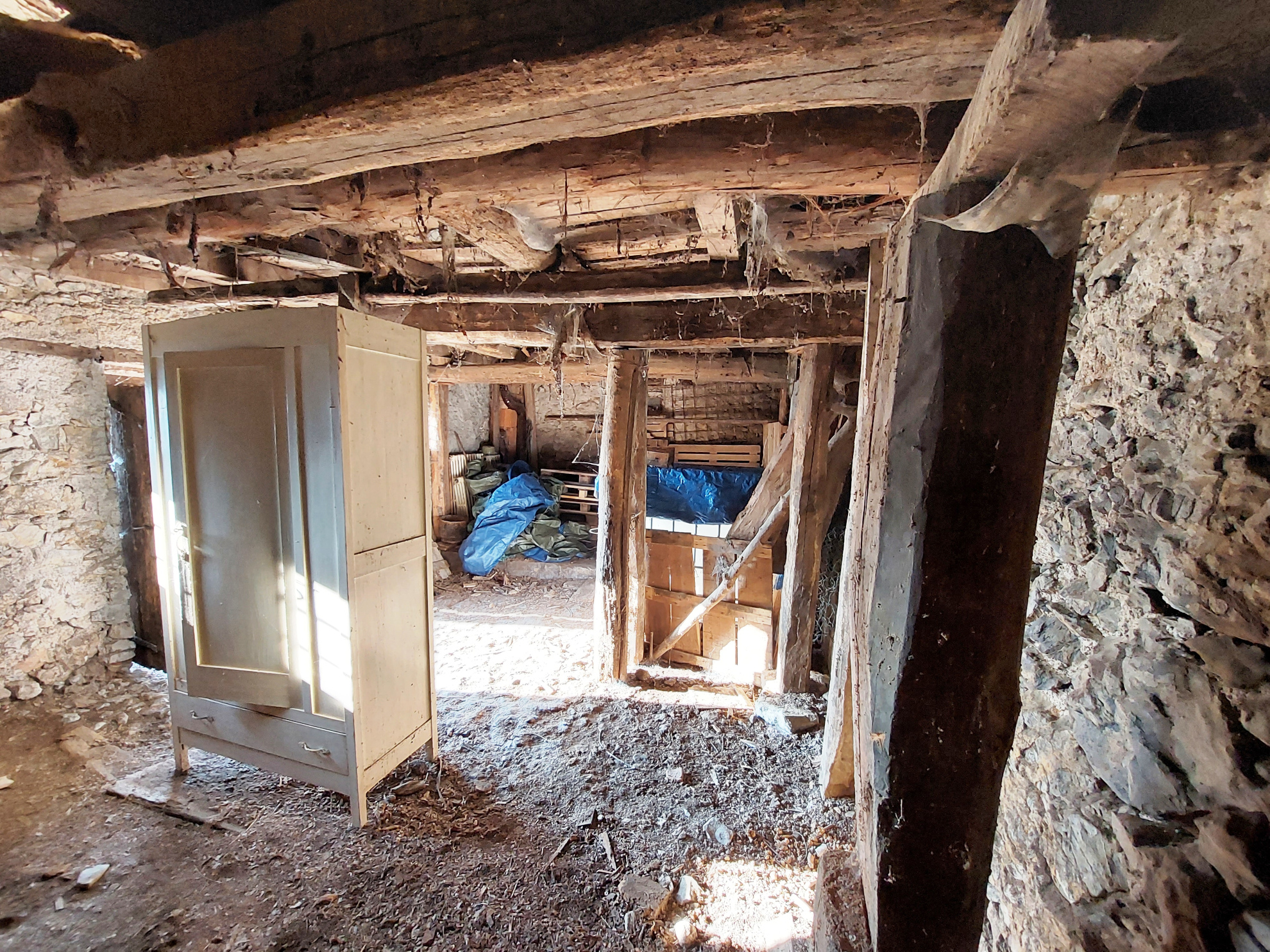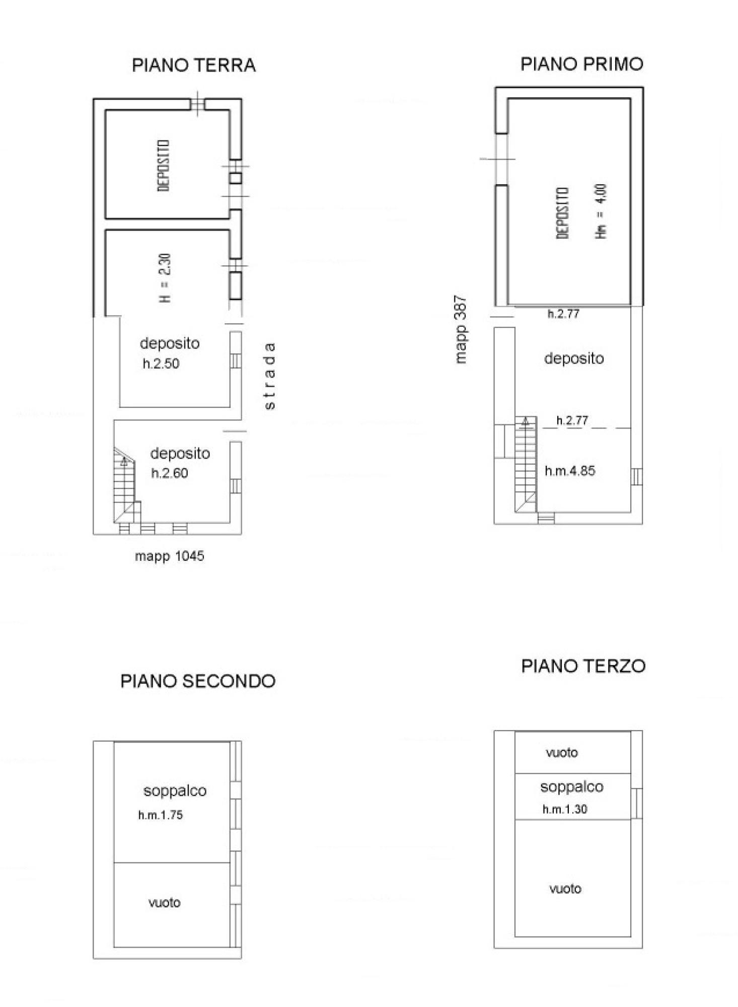 Al piano terra si trovano quattro locali oggi adibiti a deposito, mentre al piano primo due ampi ambienti offrono spazio per future zone giorno o camere. Ai livelli superiori, due soppalchi in legno, aggiungono carattere e potenziale per un recupero suggestivo.